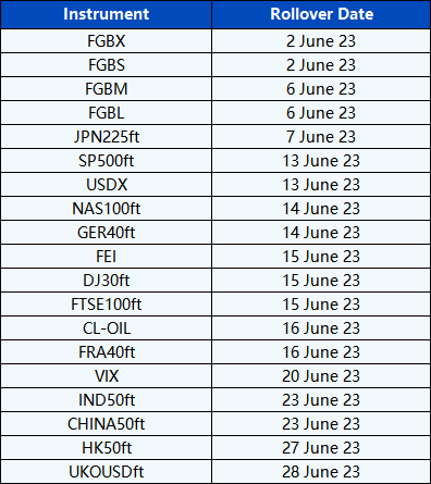 Please be advised that the following CFD instruments will be automatically rolled over as per the dates in the table below. As there can be a pricing difference between old and new futures contracts, we recommend clients to monitor their positions closely and manage positions accordingly.